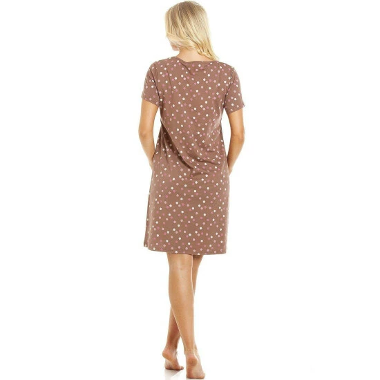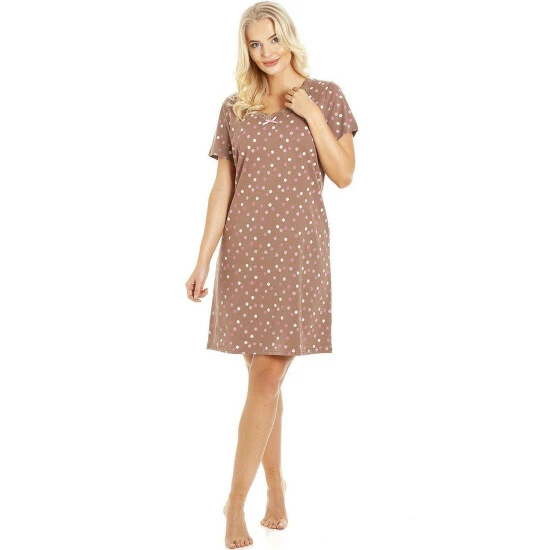 This Camille nightshirt is a great addition to any woman’s summer nightwear range. This nightshirt is made from a lightweight jersey cotton making it a great nightshirt for those warmer summer nights. This nightshirt features a stylish polka dot print and a lace detailing around the neck line.